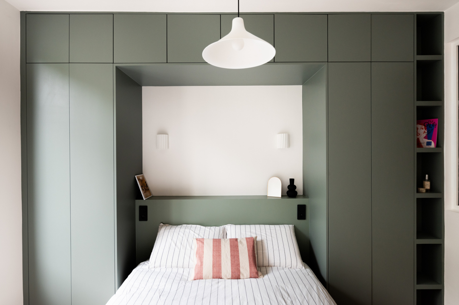 La chambre est équipée de rangements sur-mesure, tandis que le lit double offre un matelas technique de grand confort pour des nuits paisibles.
