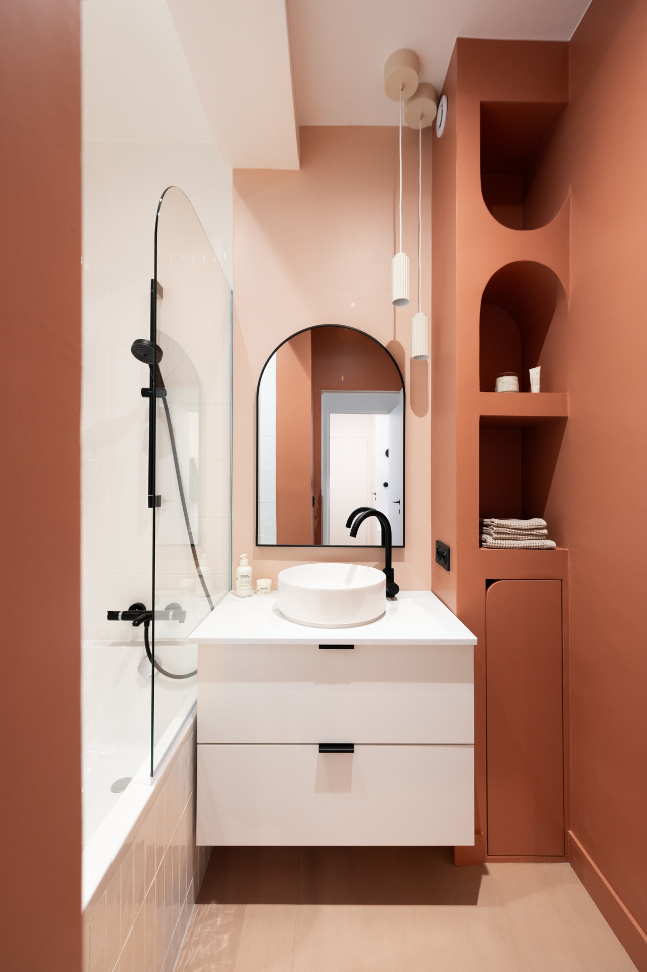 La salle de bain, avec sa palette de couleurs terracotta, a été soigneusement conçue pour créer un havre de paix où vous pourrez vous ressourcer.