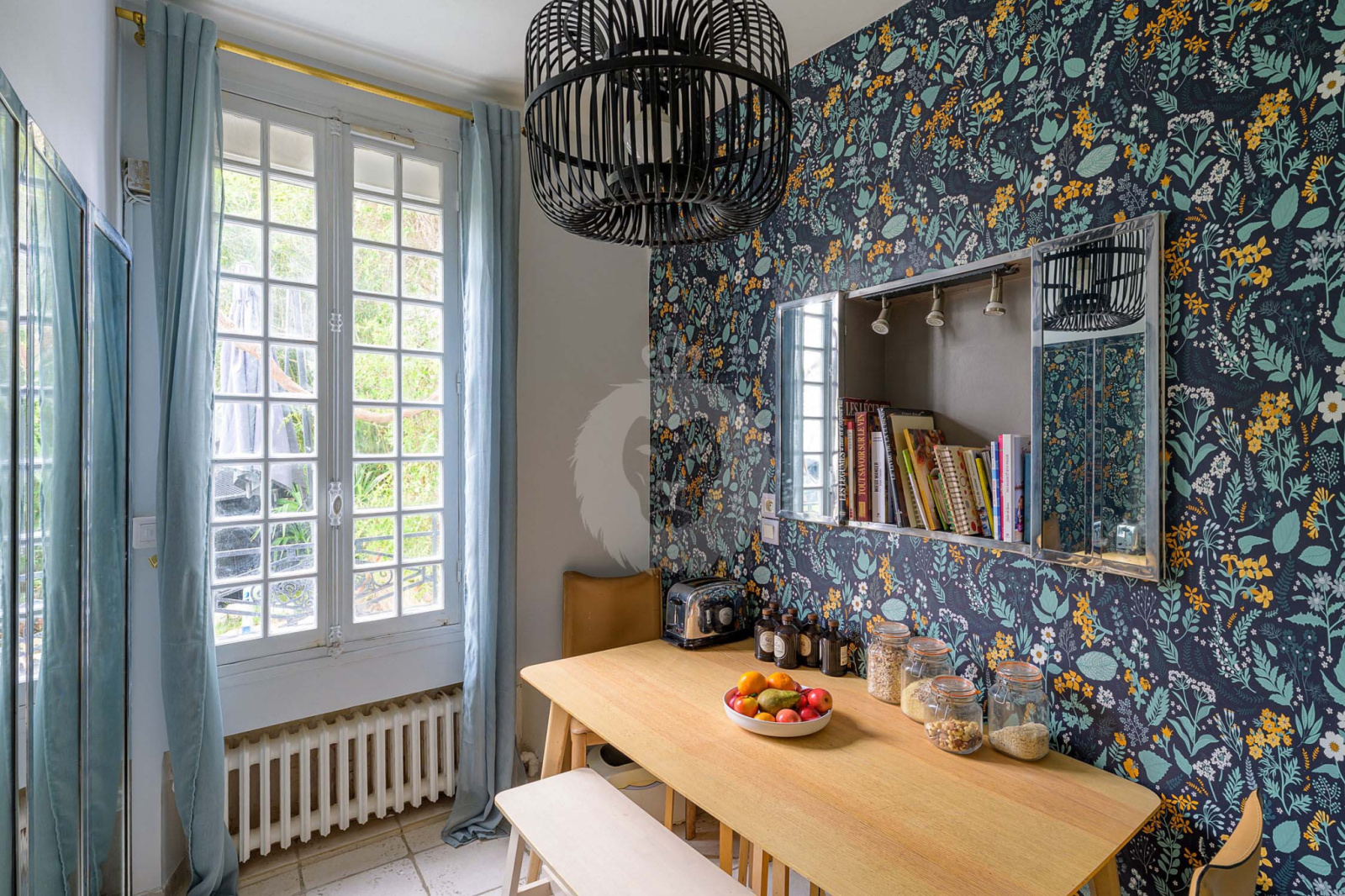 La maison, offre au rez-de-chaussée, une entrée, une cuisine avec un espace repas, toilettes indépendantes, un séjour et une salle à manger de 55m² avec comme atouts de caractère, fenêtres avec petits bois, bow window, bibliothèque et cheminée !